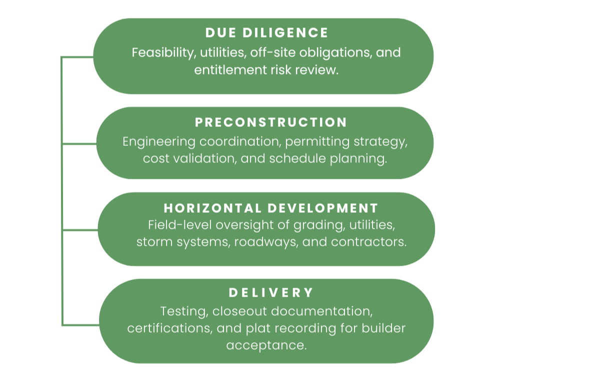 We serve as the owner’s representative throughout planning, construction, and delivery. This allows our clients to scale land positions without expanding internal development staff.
